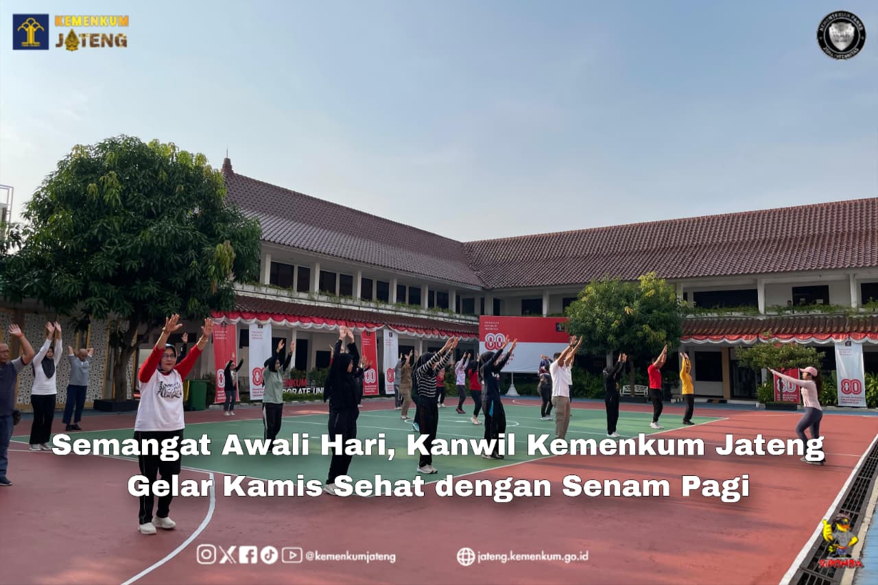 Semarang (14/08/2025) – Dalam rangka menjaga kebugaran jasmani dan meningkatkan semangat kerja, Kantor Wilayah Kementerian Hukum Jawa Tengah melaksanakan kegiatan “Kamis Sehat” dengan menggelar senam pagi bersama, Kamis (14/8), bertempat di halaman kantor.